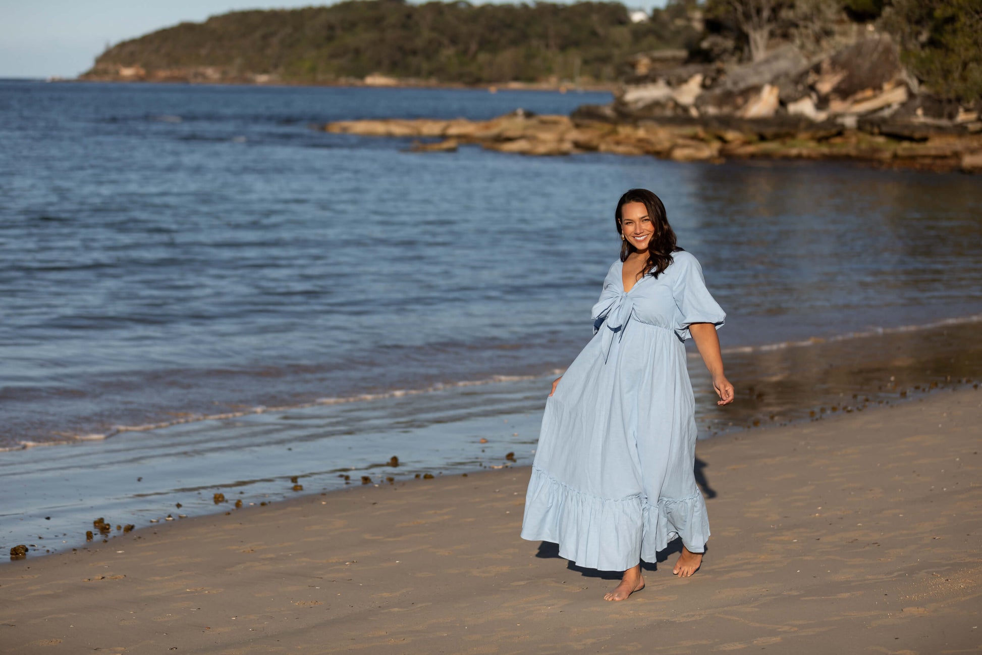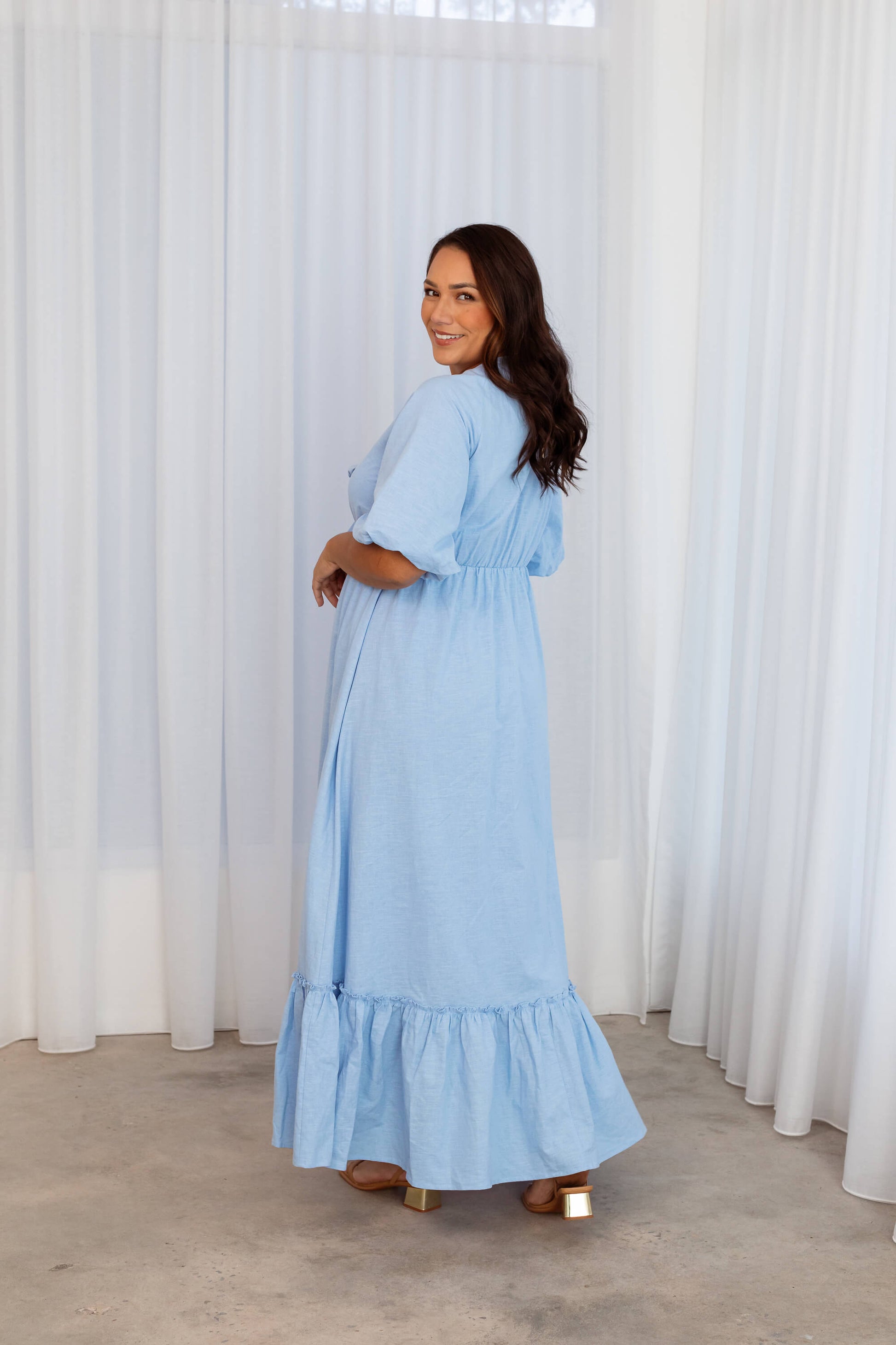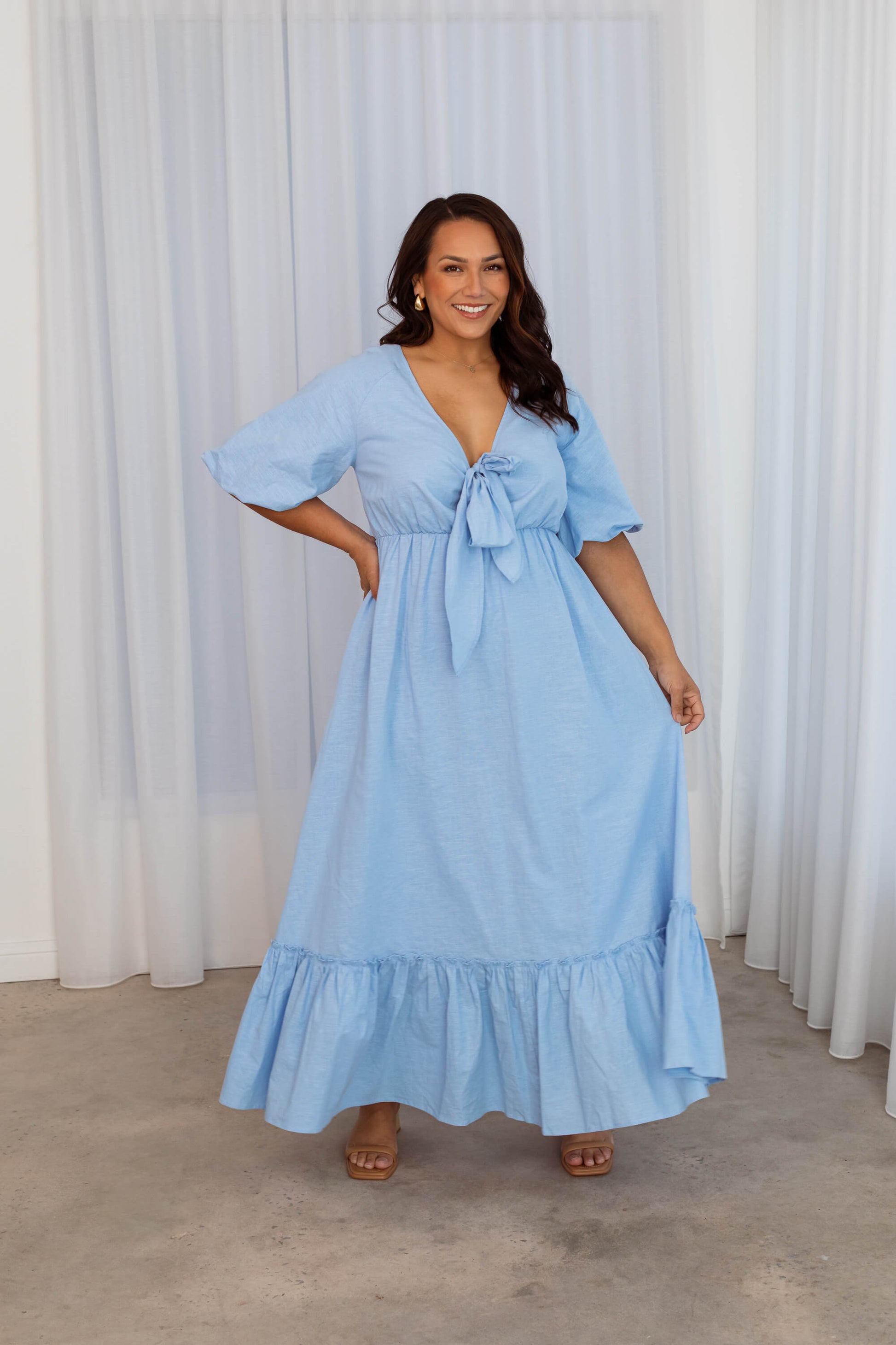 Introducing the Tara maxi dress. A playful yet elegant maxi dress with stretchy puff sleeves, crafted in elevated linen blend fabric. Developed with bigger arms in mind, so you can feel confident and comfortable.