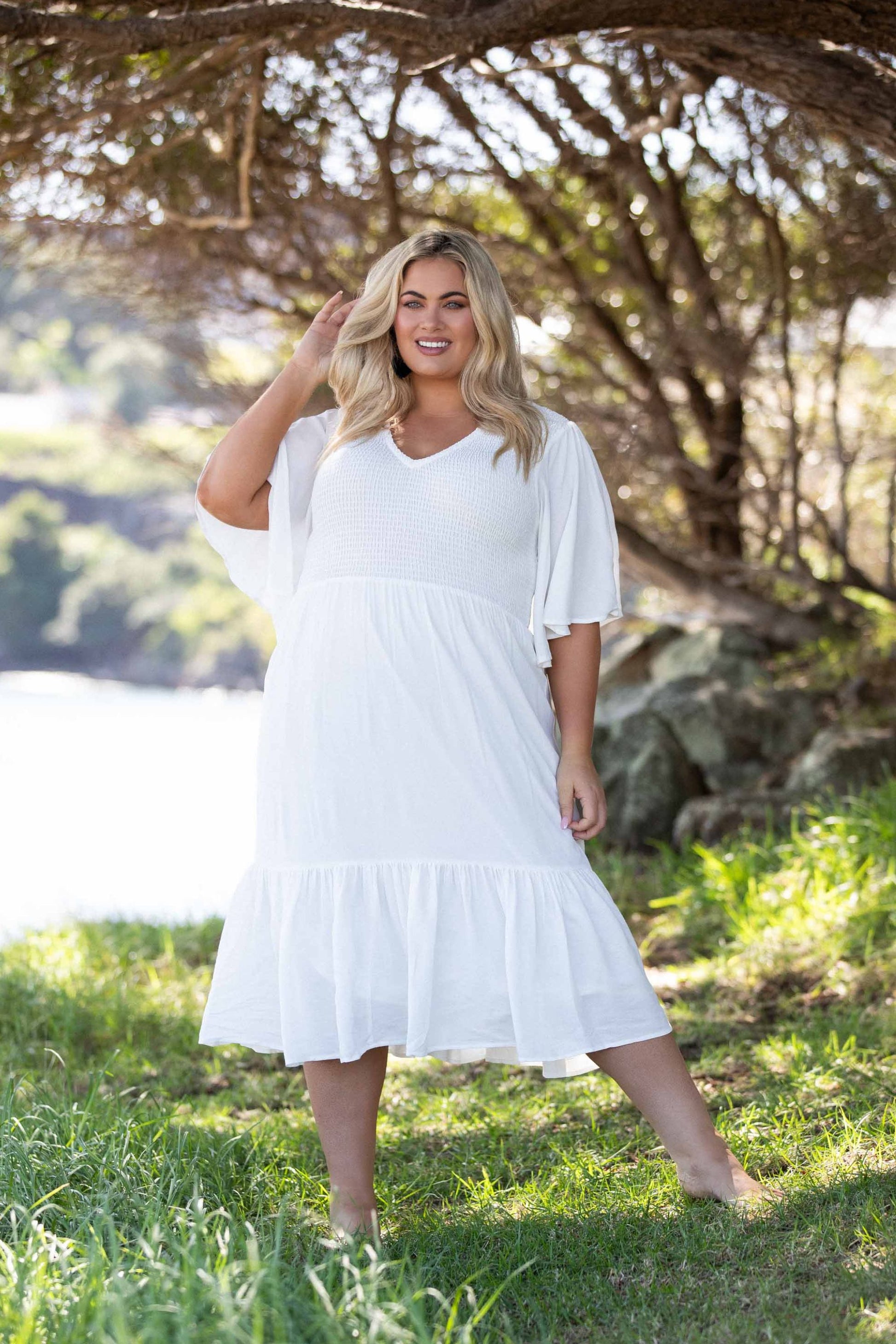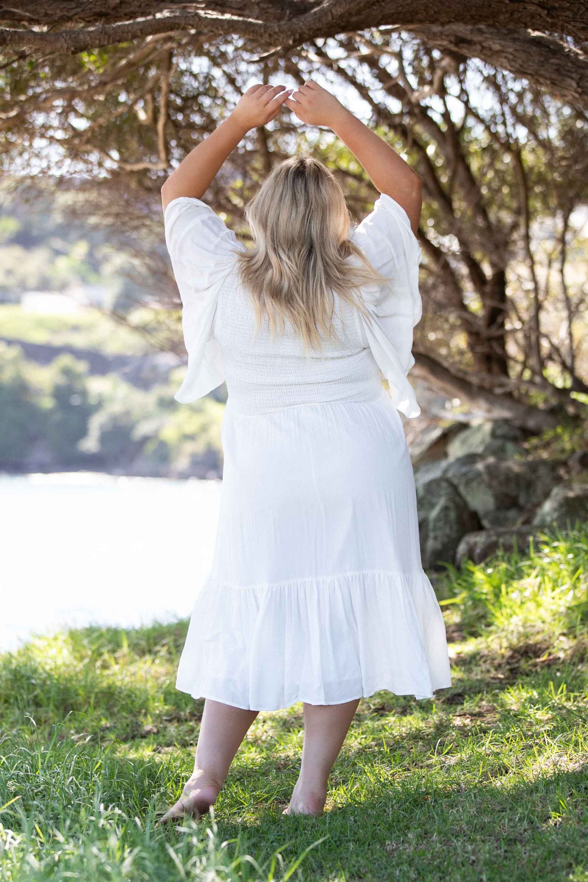 The Cleo dress is a classic midi style with floaty sleeves, lots of stretch and comfortable to wear. This versatile and flattering midi dress will quickly become your favorite go-to, that you will wear again and again.